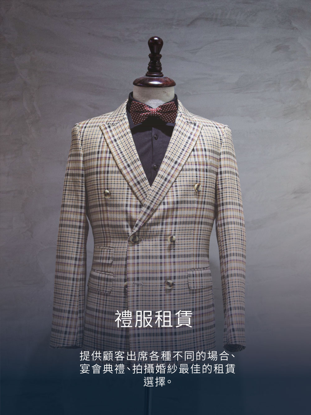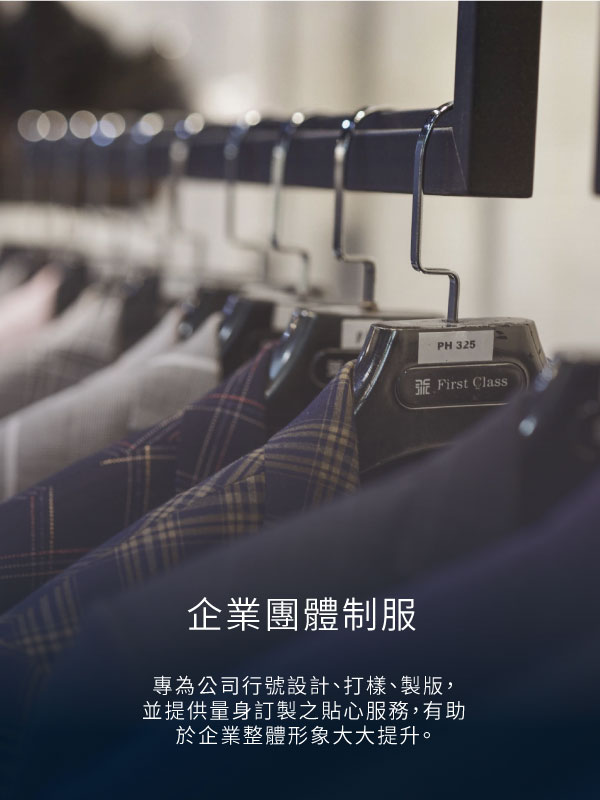 以純手工高級訂製西服為基業的一流西服於1992年成立,至今已有20多年,產品自設計、製作到銷售皆由本公司全程參與、規劃,非一般委外公司或工廠所能比擬。更順應時代潮流從歐美引進頂尖品牌之原料,不斷在技術上精益求精及創新風格款式 務求能滿足客戶的共種需求。 全台七間門市共同服務 試穿/量身可線上預約 各地區服務專線 營業時間13:00-21:30